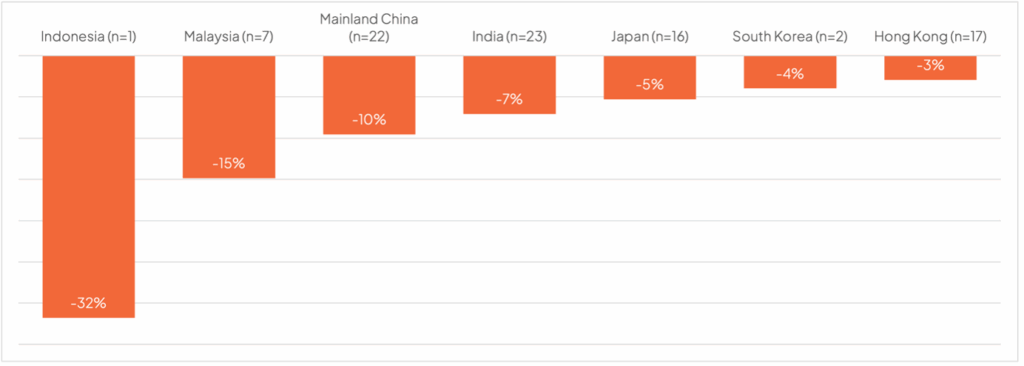 The potential reductions to companies’ collective market capitalisation across countries’ range from 3% to 32% when grouped within jurisdictions.